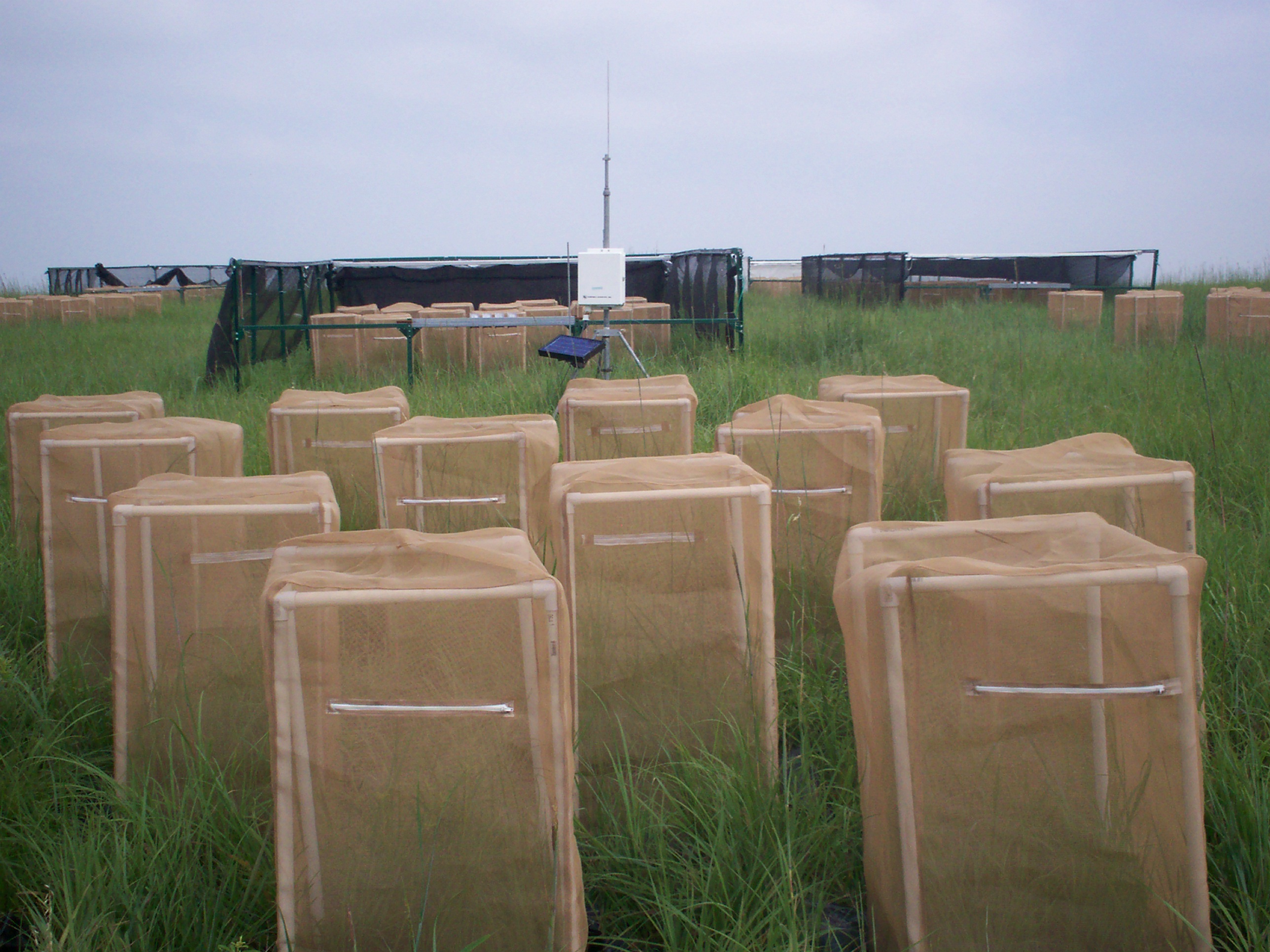 We conducted a three-year field experiment to test these predictions using common species of grasshopper (Orphulella speciosa) and wolf spider (Rabidosa rabida). We set up field cages and stocked them with grasshoppers only or grasshoppers and spiders. To alter temperature, we surrounded some of the cages with temperature chambers constructed of steel frames covered with shade cloth (decreased temperatures) or with plastic sheeting (increased temperatures). Other cages were left uncovered as a control. The roofs of these temperature chambers were mounted on garage door tracks and could be opened and closed. The roofs only covered the cages during the morning and were left open for most of the day.
