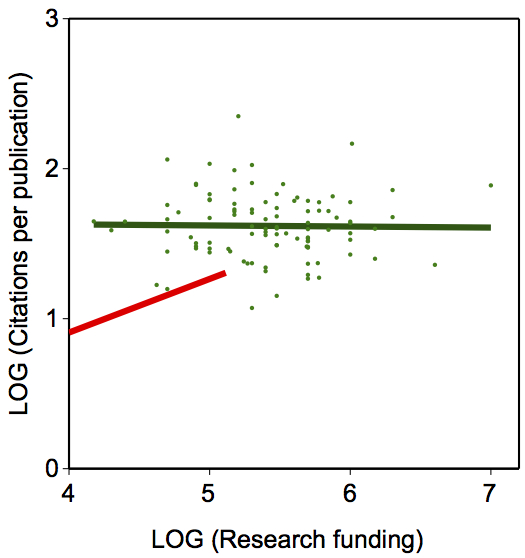 Red is Canadian NSERC Discovery Grant holders (converted to citation per publication with a mean annual funding value to match the most highly cited reporting) whilst green is the most highly cited ecologists identified by ISI. The insights/interpretations would be that (i) there is limited overlap, (ii) some of the most highly cited 'less' funded individuals approach upper funding levels of Canadians, and (iii) the two lines intercept at 5.9, back-transformed to $794,328 USD. The implication of the latter point would be that NSERC would have to significantly extend mean annual funding to ecologists for this group of scientists to become the citation elite - if recognition or discovery functioned linearly. This value might be a bit too high to hope for Canadians given that the mean funding for 2012 in ecology and evolution was $27,167 (full stats here).