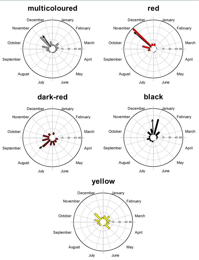 Circular histograms for the frequency of fruiting onset dates per fruit colors in a woody cerrado savanna community, southeastern Brazil. We found that black, and particularly red fruits, that have a high contrast against the leaf background, were highly seasonal, peaking in the wet season. Multicolored and yellow fruits were less seasonal, not limited to one season, with a bimodal pattern for yellow ones, represented by two peaks, one in each season. We further supported the hypothesis that seasonal changes in fruit contrasts can be adaptive because fruits contrasted more strongly against their own foliage in the wet season, when most fruits are ripe. Hence, the seasonal variation in fruit colors observed in the cerrado-savanna may be, at least partly, explicable as an adaptation to ensure high conspicuousness to seed dispersers.