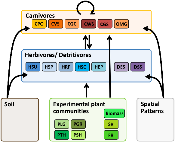 Using a set of five groups of biotic and abiotic predictor variables (Plants, Herbivores/Detritivores, Carnivores, Soil, and Spatial patterns), we aimed to determine the independent and shared fractions of variation explained by these variables in the composition of all consumer functional groups. Depending on the trophic level of the predictor variables, we quantified the relative roles of top-down and bottom-up effects.