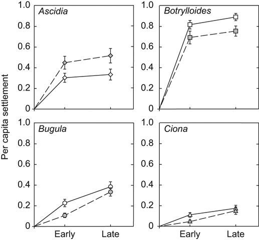 "In organisms with sessile adults (e.g. many plants and marine invertebrates) variation in the density of colonisers is known to have a profound influence on the structure of populations and communities. Recent studies also indicate that the relatedness among interacting adults can be an important driver of differences in ecological performance among populations. Thus, it is surprising that few studies have examined the effects of relatedness on the non-adult life-history stages, and thereby the effects of relatedness on colonisation processes. In our study we bridged the gap between these two lines of ecological enquiry, and found that the effects of relatedness on colonisation differed in direction and magnitude in four sessile marine invertebrates."