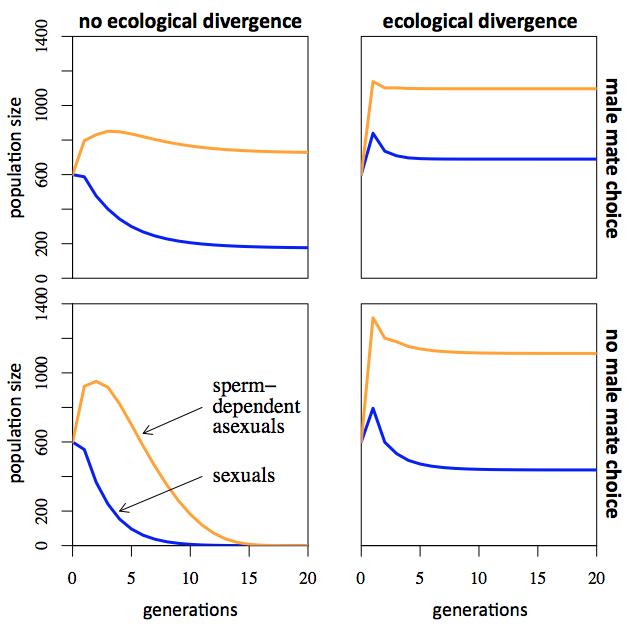 In addition to being a fascinating natural oddity, the existence of sperm-dependent asexuals raises an interesting scientific question: how do sperm-dependent asexuals coexist with their host species? All-female asexuals have a great advantage over sexuals – by producing no males, the asexuals have twice the potential population growth rate relative to the sexuals. But, in the case of sperm-dependent asexuals, vastly outcompeting the sexuals (i.e., eliminating the source of sperm) would eliminate the ability to reproduce. There are two general mechanisms by which sperm-dependent asexuals and their sexual hosts can achieve stable coexistence. First, sufficient ecological divergence between the sexuals and asexuals would avoid competitive exclusion. Second, if males prefer mating with sexual females rather than asexual females, asexual females would be more sperm limited (and have reduced reproductive output) relative to sexual females.