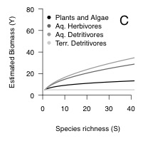 As a first step toward answering this question, we used a hierarchical mixed effects modeling approach to re-analyze a database of hundreds of experiments that manipulated species richness and measured standing biomass. We found that for nearly all tests, a relationship of Y = a x Sb describes the change in biomass (Y) with a change in species richness (S) for plants and algae, but that different exponents (b values) are required for herbivores and detritivores (Figure 2). Thus, the empirical evidence supports a repeatable relationship between diversity and function that is significant, and does not vary systematically with ecosystem type, experimental design, level of species richness tested, or other potential drivers.