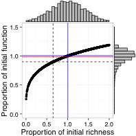 Figure 3: Expected change in biomass associated with changes in species richness. Distribution of species richness changes (top histogram), expressed as a response ratio (ln(STime1/STime2)), and the distribution of associated change in biomass (vertical histogram), expressed as ln(YTime1/YTime0) expected for primary producers. The distribution of expected function was produced using Y = aSb (the plotted curve) for values of b = 0.26. Solid blue lines indicate response ratios of 1 = no change in richness; and the red lines indicate the mean expected function. Dashed lines identify a 10% decline in standing biomass, and the intersection with the BEF curve identifies the change in plant richness (35%) expected to cause a 10% change in biomass.