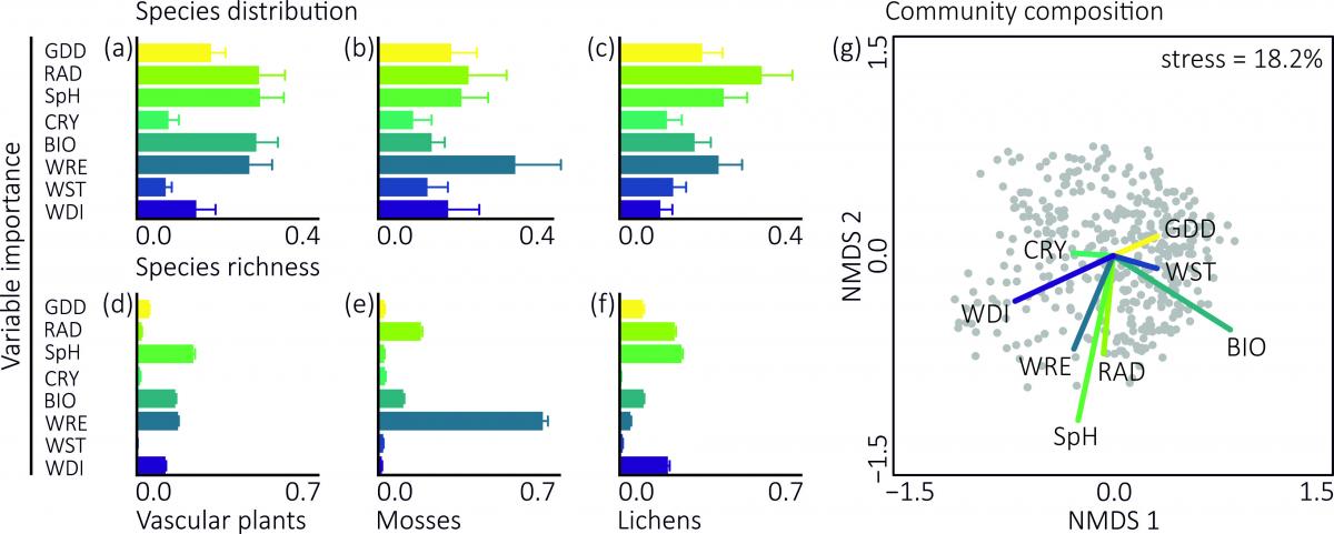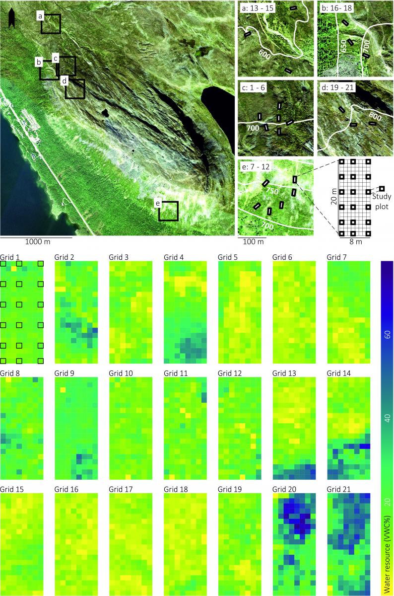 Using a species distribution modelling approach, we found that the different water aspects proved to be crucial environmental drivers of fine-scale vegetation patterns. Water acts as a driver of vegetation not only on individual species level, but it also shapes community characteristics. And in this particular system and for these species, the importance of spatial variability of water exceeds the importance of soil temperature.