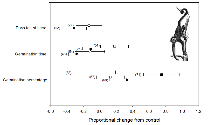 Effect of passage through primate gut on germination percentage, germination time and days to first seed germinate. Numbers in parentheses indicate the number of independent comparisons for each effect and effects are significant if confidence intervals (black bars) do not overlap with zero.