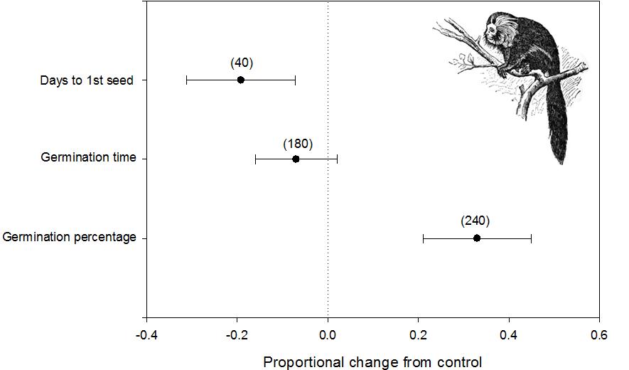 The larger the frugivore, the more fruits it eats. Monkeys are the largest arboreal frugivores in tropical forests and are able to spread thousands or even millions of seeds per year. But, unfortunately, how seed passage through their guts affects seed germination is still not well documented. Here, we summarize available data on seed dispersal by tropical monkeys running a meta-analysis, a statistical approach that allows us to contrast results and identify patterns among different studies. Our goal is to show how germination of forest trees is affected by monkey digestive systems taking into account effects of distinct body sizes, diets and gut morphologies, which determine distinctive roles as seed dispersers. We observed significant and positive effects of passage through a monkey’s gut on seed germination percentage and on the number of days to first germination of a seed. We show a previously unrecognized positive effect of gut passage in increasing seed germination by 33% and decreasing germination time by nearly 20%, suggesting they may play a major role in forest structure, dynamics and ecosystem services. That means a third more chance of germination and much less time to germinate after been swallowed by a monkey.